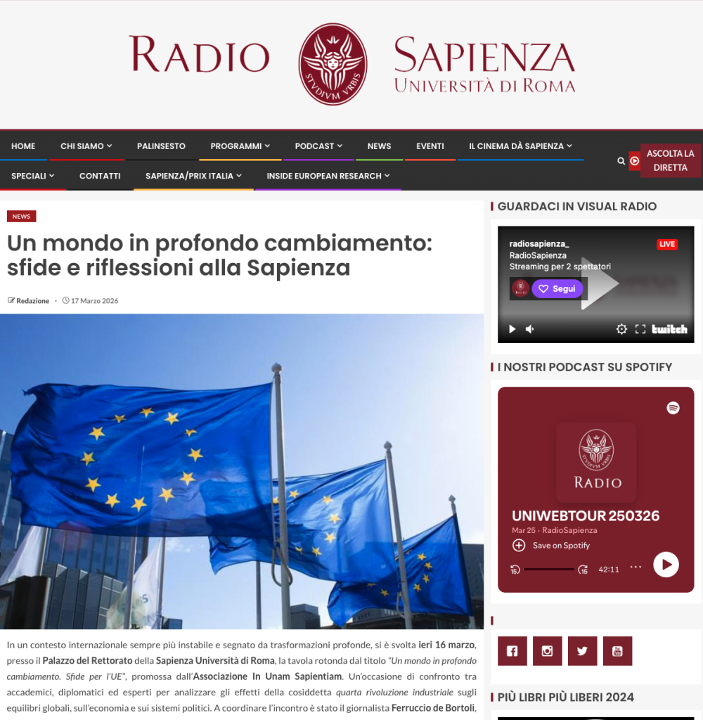 In un contesto internazionale sempre più instabile e segnato da trasformazioni profonde, si è svolta ieri 16 marzo, presso il Palazzo del Rettorato della Sapienza Università di Roma, la tavola rotonda dal titolo “Un mondo in profondo cambiamento. Sfide per l’UE”, promossa dall’Associazione In Unam Sapientiam. Un’occasione di confronto tra accademici, diplomatici ed esperti per analizzare gli effetti della cosiddetta quarta rivoluzione industriale sugli equilibri globali, sull’economia e sui sistemi politici. A coordinare l’incontro è stato il giornalista Ferruccio de Bortoli, che ha guidato il dibattito tra i relatori, introdotti dal professore Roberto Pasca Di Magliano. Al centro della discussione vi sono stati il ruolo crescente delle innovazioni tecnologiche e delle grandi imprese digitali, capaci di influenzare scelte strategiche degli Stati in ambiti cruciali come la sicurezza, la difesa e la gestione dei conflitti.