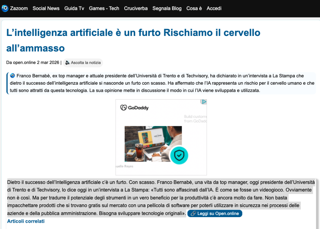 Dietro il successo dell’Intelligenza artificiale c’è un furto. Con scasso. Franco Bernabè, una vita da top manager, oggi presidente dell’Università di Trento e di Techvisory, lo dice oggi in un’intervista a La Stampa: «Tutti sono affascinati dall’IA. È come se fosse un videogioco. Ovviamente non è così. Ma per tradurre il potenziale degli strumenti in un vero beneficio per la produttività c’è ancora molto da fare. Non basta impacchettare prodotti che si trovano gratis sul mercato con una pellicola di software per poterli utilizzare in sicurezza nei processi delle aziende e della pubblica amministrazione. Bisogna sviluppare tecnologie originali».
