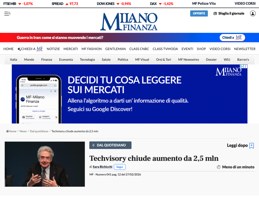 Techvisory chiude un aumento di capitale di circa 2,5 milioni di euro, sottoscritto da investitori istituzionali e family office.